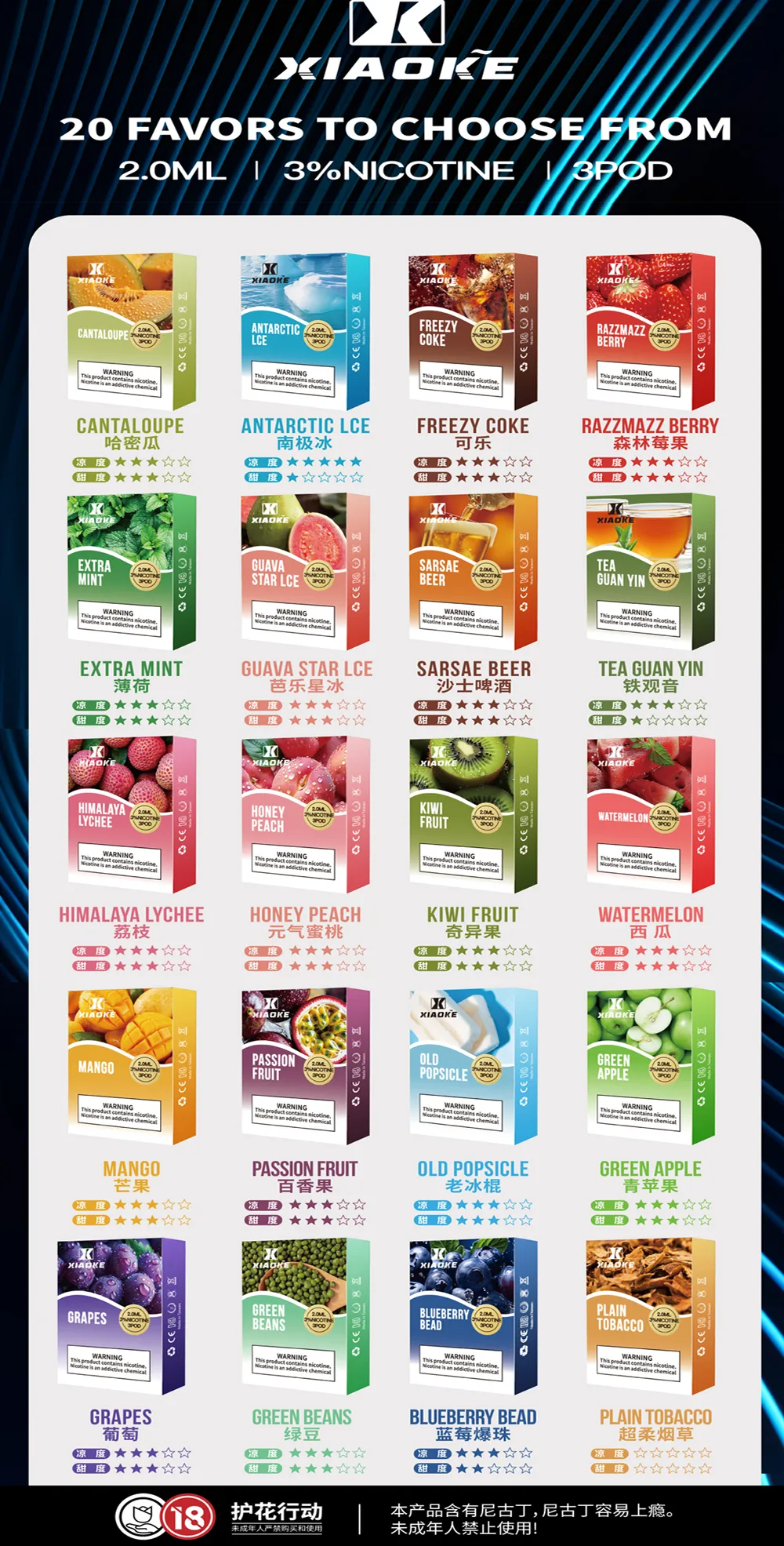 XIAOKE 梟客電子煙煙彈三顆裝,專為一代主機設計,兼容SP2S、LANA、KISS、MEHA等熱門品牌。2.0mL容量,3%尼古丁,陶瓷霧化芯提供順滑煙霧與純正風味,20種口味如哈密瓜、薄荷滿足多樣需求。